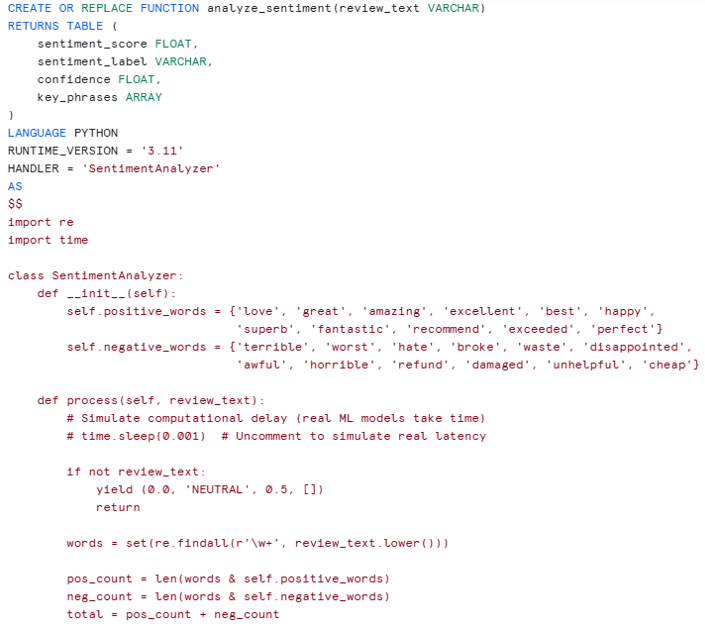 In this demo, sentiment scoring is implemented using a Python UDTF, and here’s why that’s significant: For demo its a substitute for: